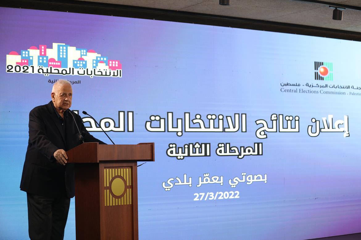 وقال رئيس لجنة الانتخابات المركزية حنا ناصر في مؤتمر صحفي عقده، اليوم الأحد، في المركز الإعلامي داخل مقر اللجنة بالبيرة، إن نسبة الاقتراع النهائية في المرحلة الثانية بلغت 53.69% من أصحاب حق الاقتراع البالغ عددهم 715,413، مبيناً أن هذه النسبة صدرت بعد انتهاء كافة المقترعين المتواجدين داخل المراكز من الإدلاء بأصواتهم.