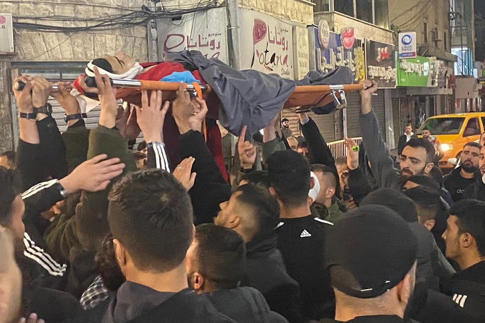 جثمان الشهيد عمر أبو بكر محمولا على الأكتاف في مدينة جنين (تصوير: ثائر أبو بكر/وفا)
